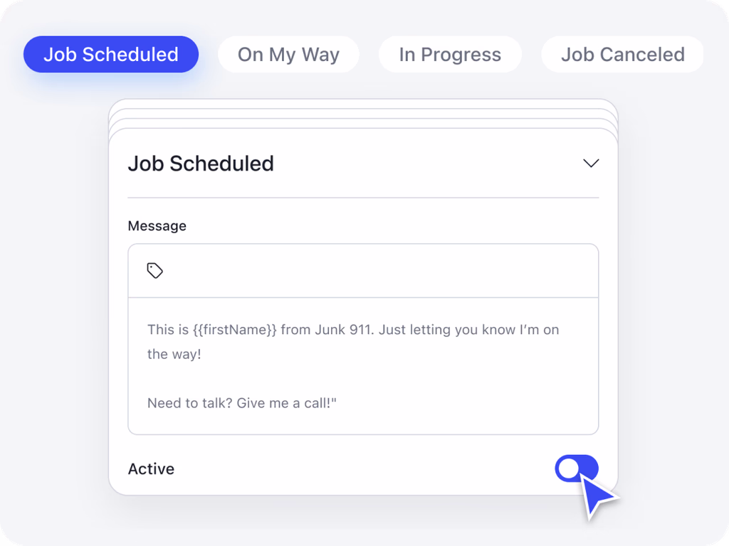 Automate key updates across job phases with tabs for Job Scheduled, On My Way, In Progress, and Job Canceled. The Job Scheduled tab includes a message text field and an “Active” toggle button to manage automation settings easily.