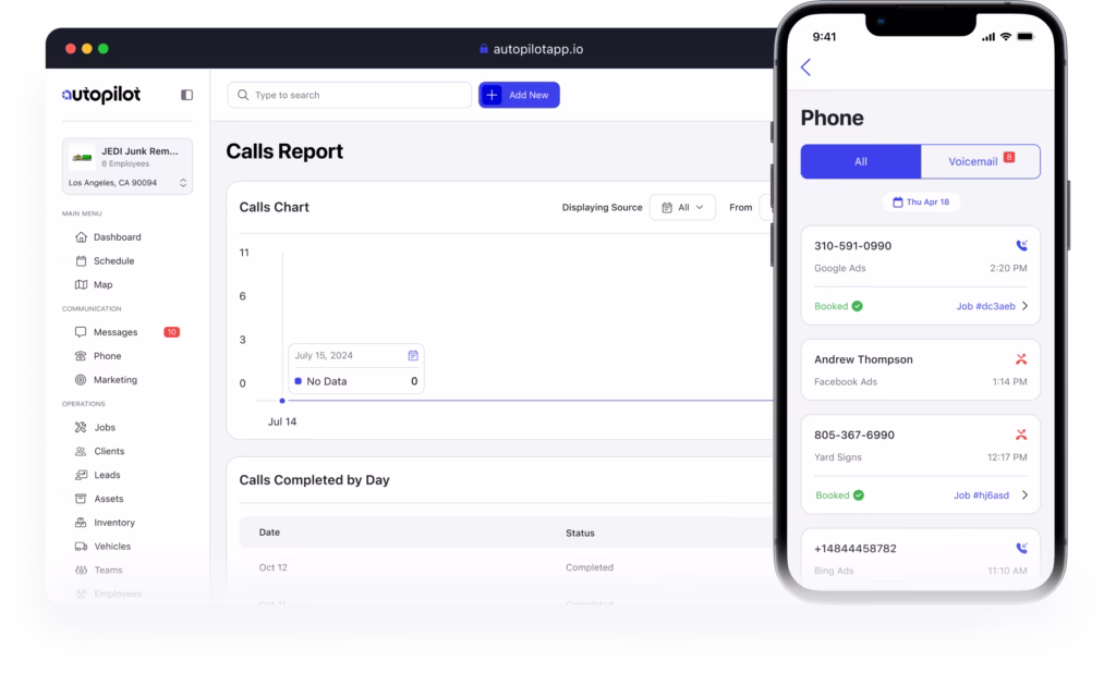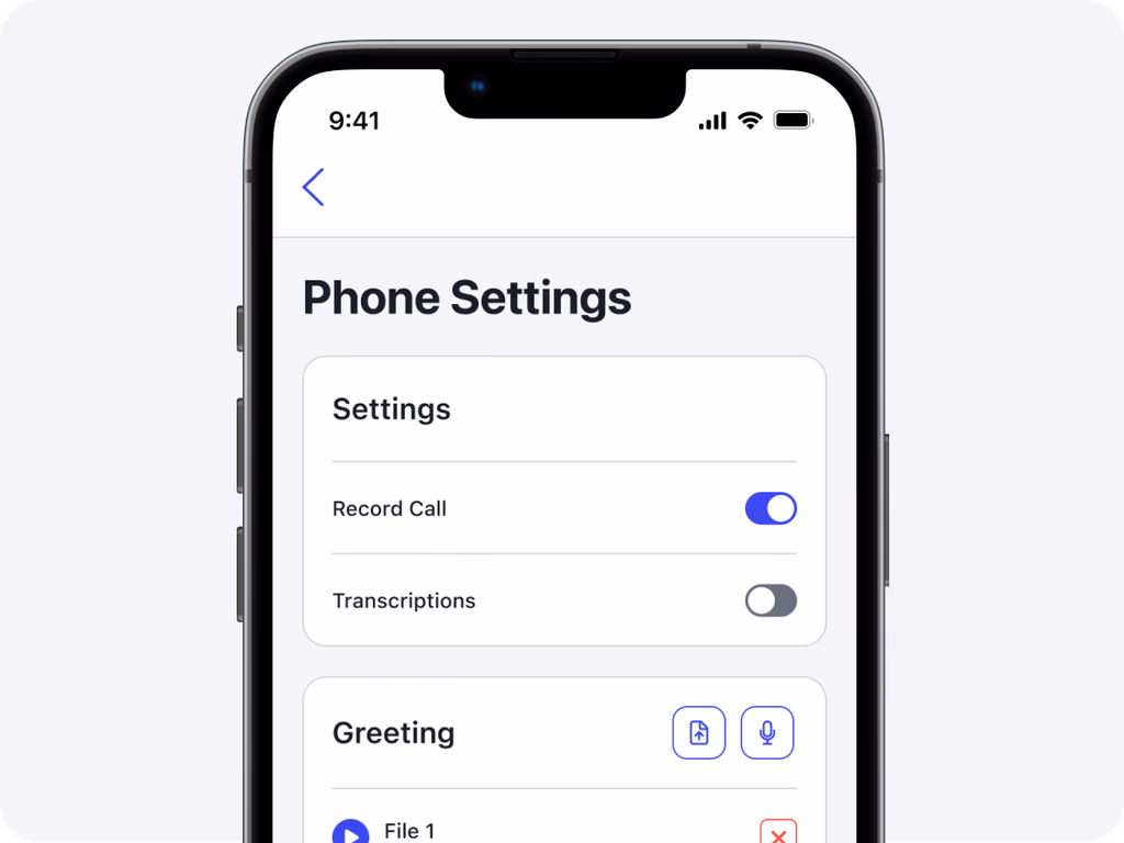 Phone Settings with options for recording, enabling transcriptions, and managing custom greeting recordings. Record, upload, or replay calls, providing comprehensive documentation of each interaction.