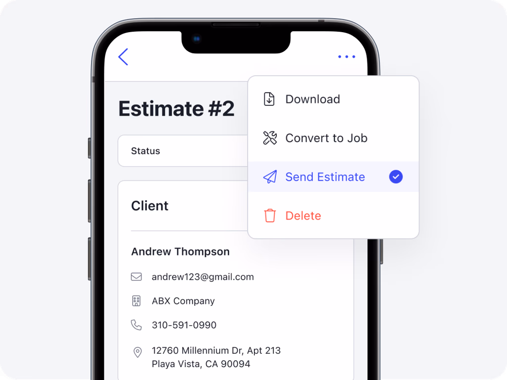 Easily send estimates from your mobile device with a convenient dropdown menu. Options include downloading, converting to a job, sending the estimate, or deleting it as needed.