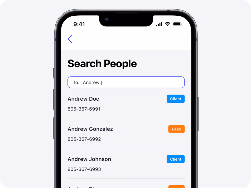 Easily search by name, phone number, and view whether the contact is a client or lead, making it quick to locate and connect with the right person.