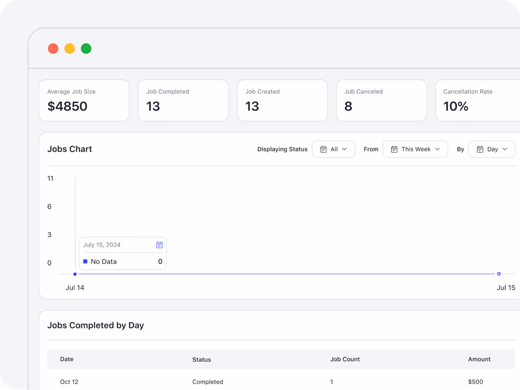 Track daily job completion with a detailed chart and table. The “Jobs Completed by Day” report provides insights into job volume over time for improved scheduling and resource allocation.