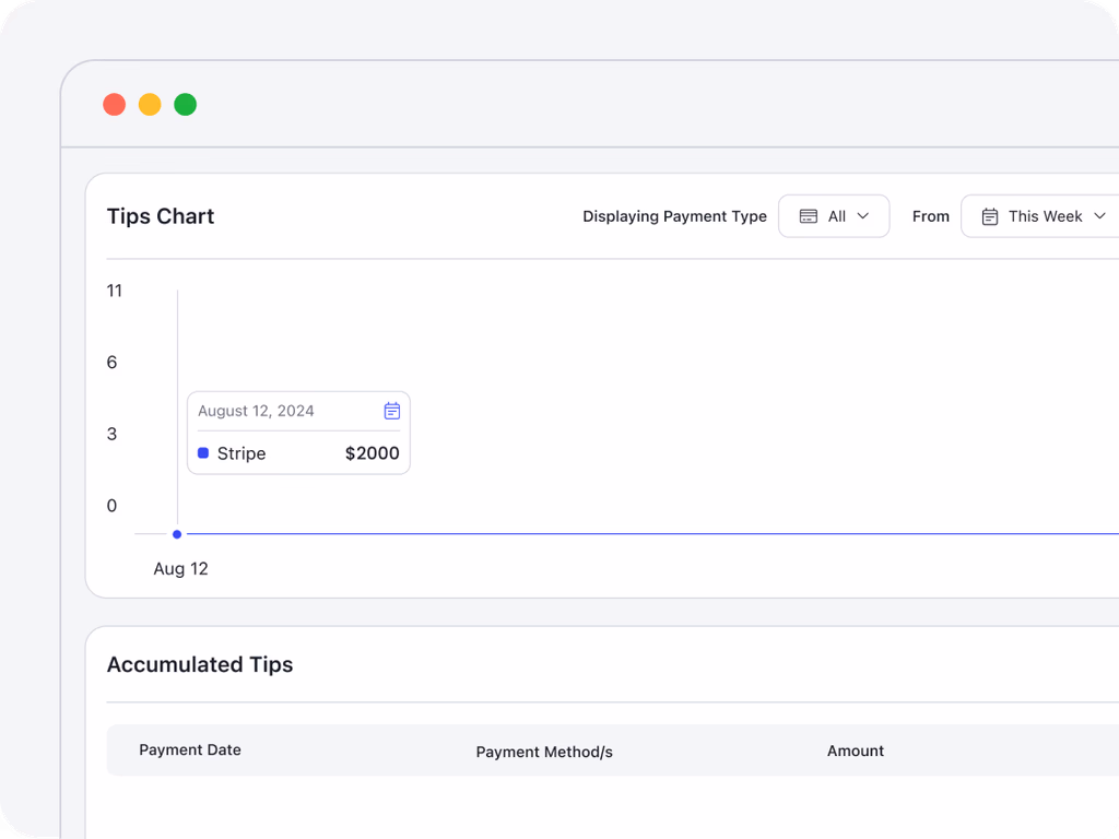The “Accumulated Tips” chart and table provide a clear view of tips earned over time, helping you assess client satisfaction and employee performance.