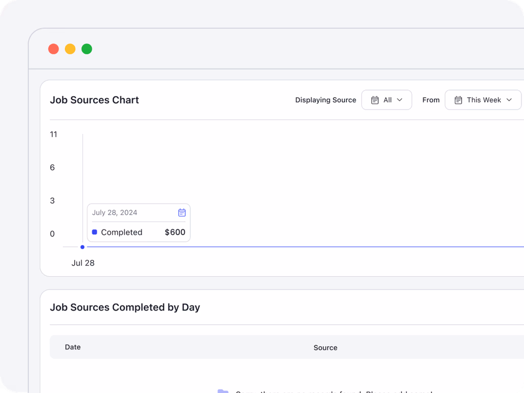 View the “Job Source Completed by Day” chart and table to analyze which sources drive the most completed jobs, giving you actionable insights into successful lead sources.