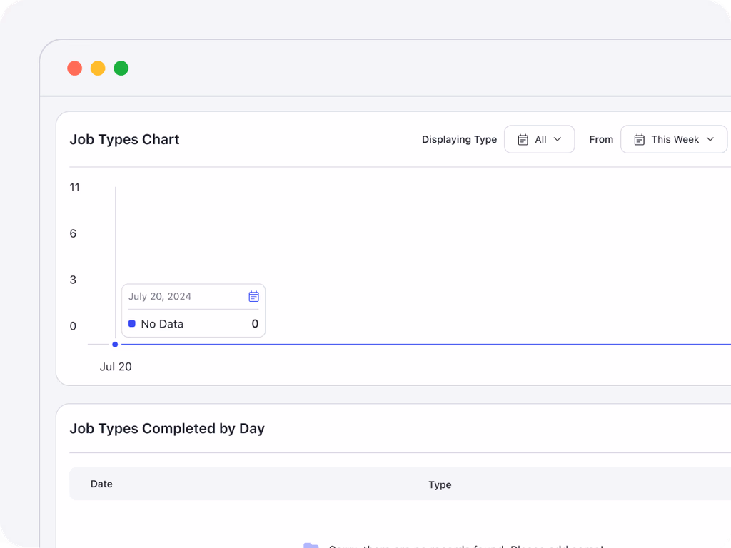 See a breakdown of completed job types with a chart and table, “Job Types Completed by Day,” helping you identify high-demand services and prioritize resource distribution.