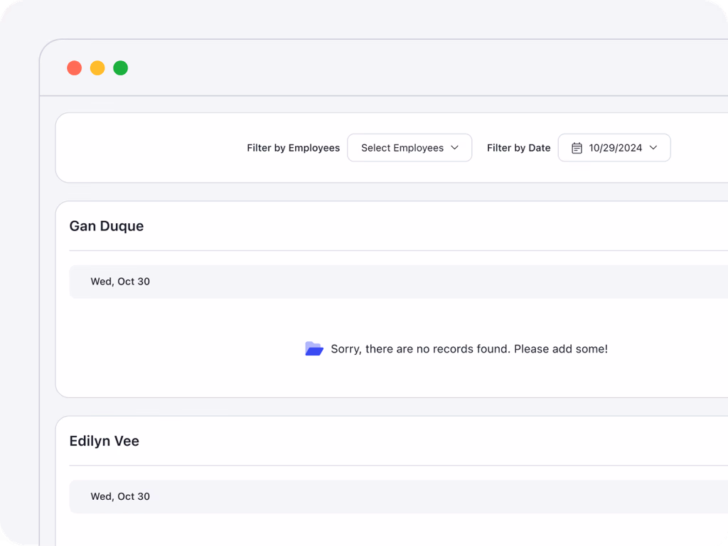 Filter by employee to view the “Time Clock Report” with a detailed table of each employee’s working hours by date, allowing for efficient payroll and time management.