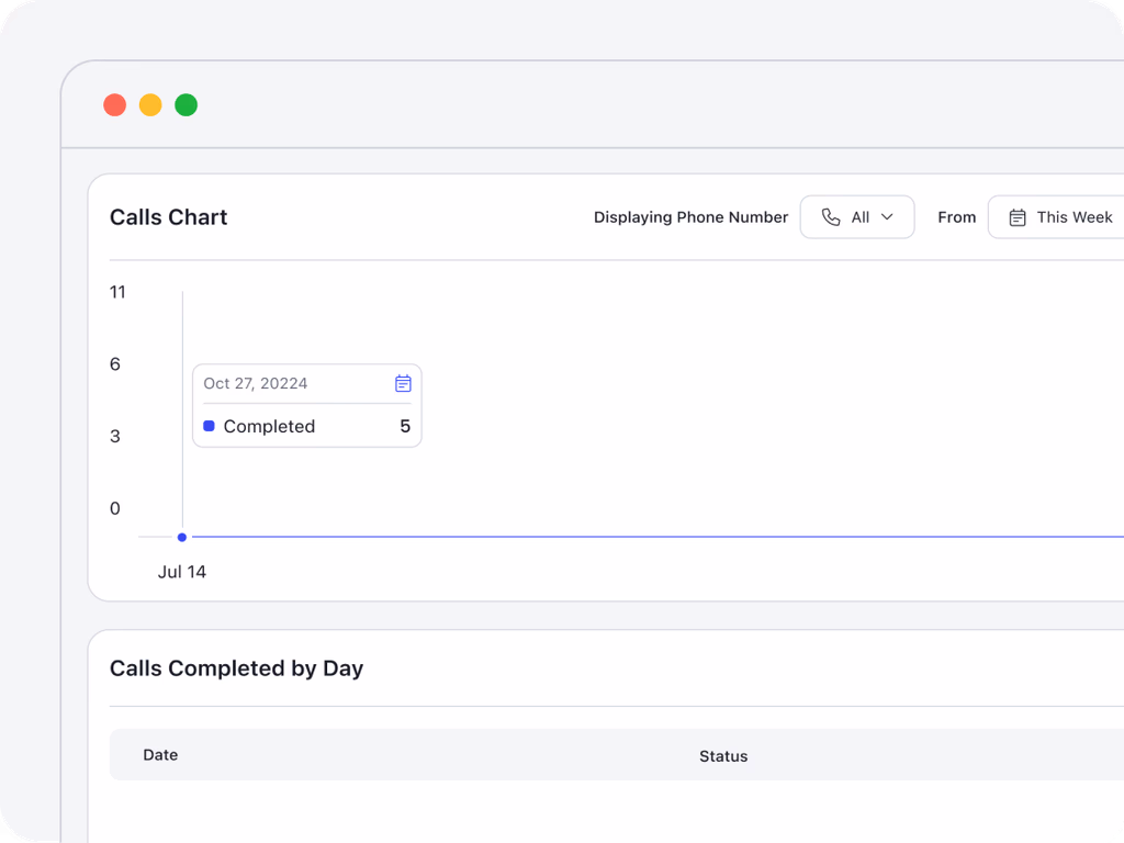 Compare daily call activity with the “Call Compared by Day” report, using a chart and table to track customer engagement and response rates.